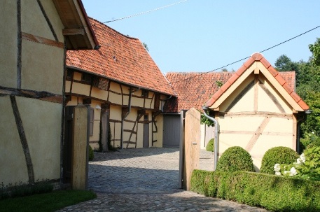 De vermelde poort leidt via een brug over de gracht; daar bevindt zich een open schob op bakstenen pijlers.